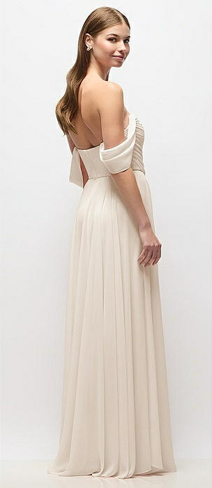 Strapless Chiffon Maxi Dress with Asymmetrical Ruched Drop Waist in oat