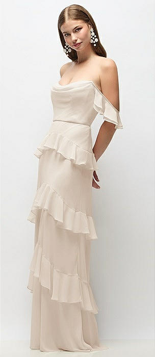 Off-the-Shoulder Cowl Chiffon Tiered Ruffle Maxi Dress with Convertible Ruffle Straps in oat