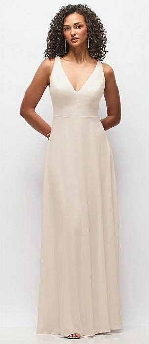 Plunge Neckline Bow Shoulder Empire Waist Chiffon Maxi Dress in oat