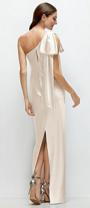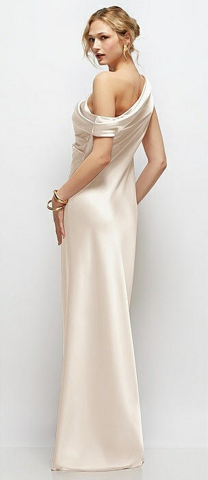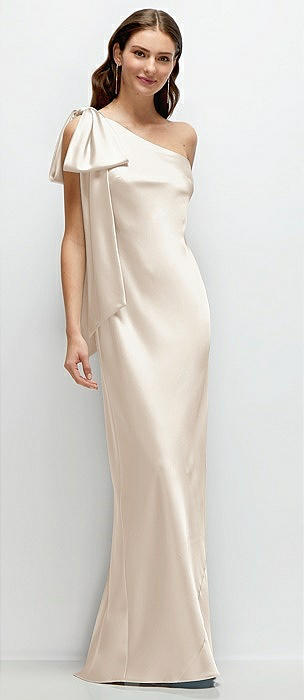 One-Shoulder Bias-Cut Satin Maxi Dress with Cascading Shoulder Bow in oat