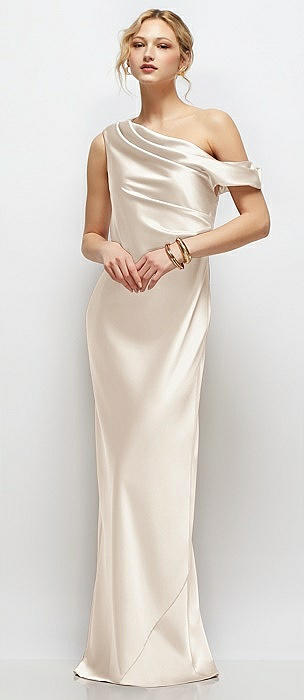 One-Shoulder Draped Cowl A-Line Satin Maxi Dress in oat