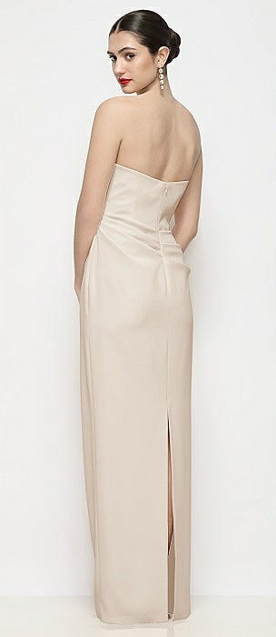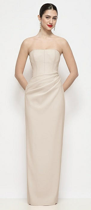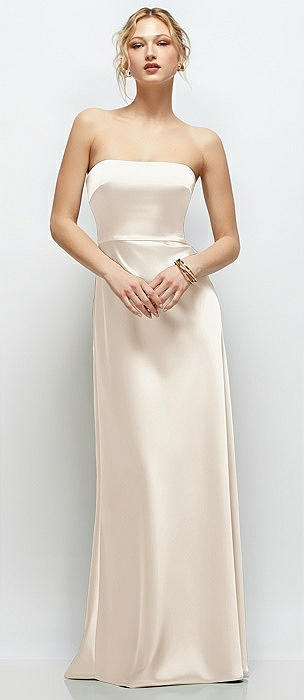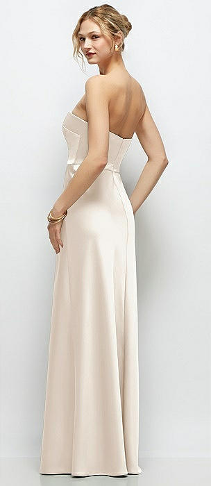 Strapless Topstitched Corset Satin Maxi Dress with Draped Column Skirt in oat
