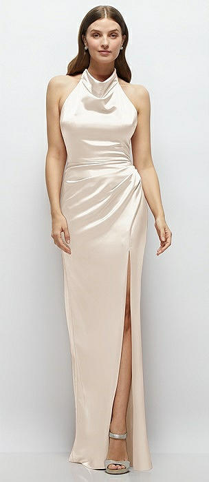 Cowl Halter Open-Back Satin Maxi Dress in oat