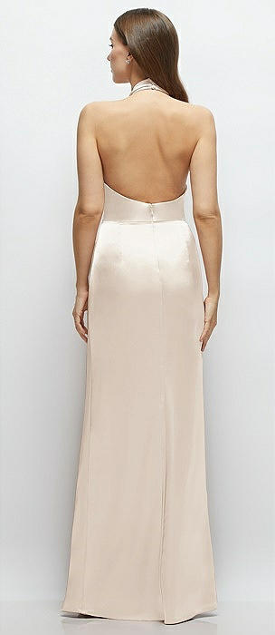 Criss Cross Halter Open-Back Stretch Satin Mermaid Dress in oat