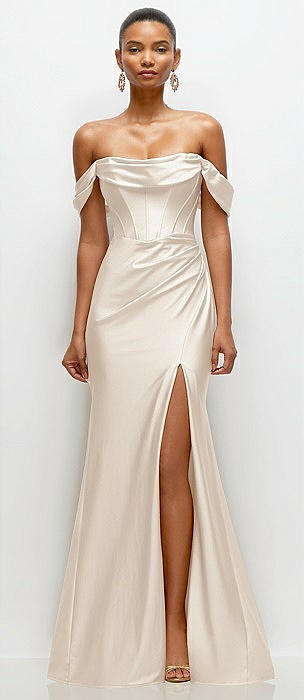 Off-the-Shoulder Corset Stretch Satin Mermaid Dress with Slight Train in oat