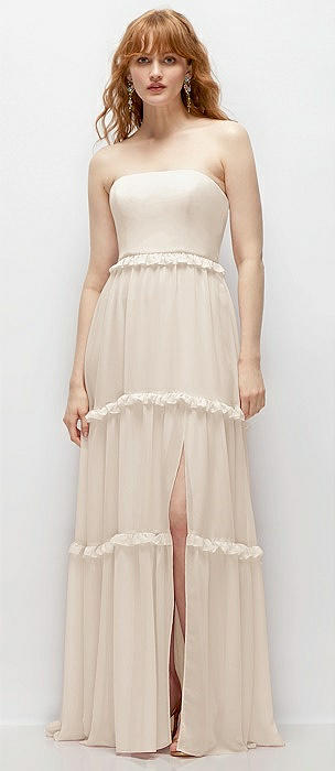 Strapless Chiffon Maxi Dress with Tiered Micro Ruffle Full Skirt in oat