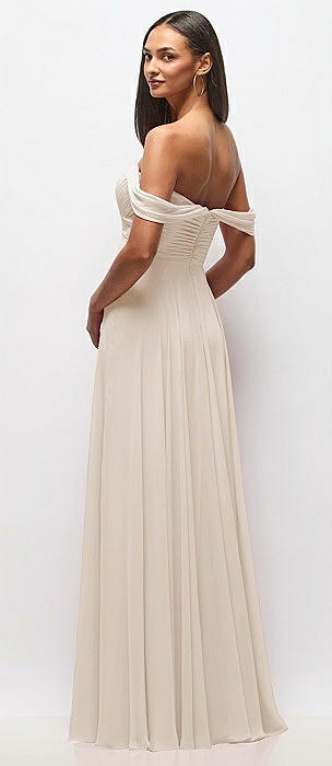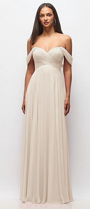 Off-the-Shoulder Draped Chiffon Maxi Dress in oat