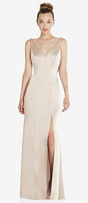Bow-Shoulder V-Back Chiffon Gown with Front Slit in oat