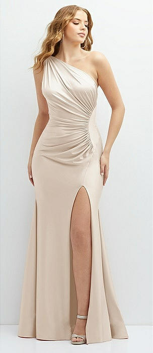 Shirred One-Shoulder Satin Trumpet Dress - Maddie in oat