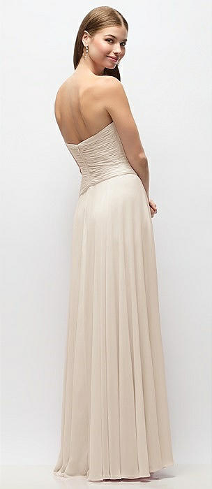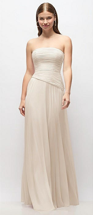 Strapless Chiffon Maxi Dress with Asymmetrical Ruched Drop Waist in oat