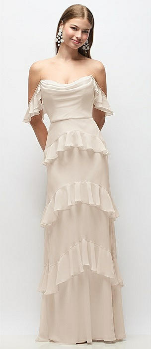 Off-the-Shoulder Cowl Chiffon Tiered Ruffle Maxi Dress with Convertible Ruffle Straps in oat
