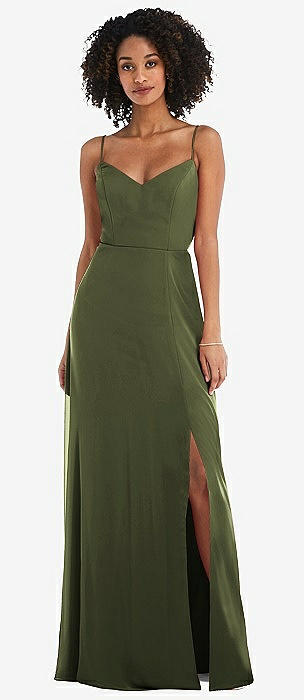 V-Neck Convertible Strap Bias Slip Dress with Front Slit in olive green