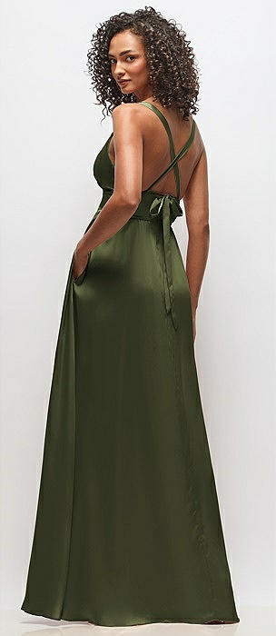 Draped Satin Grecian Column Gown with Convertible Straps in olive green