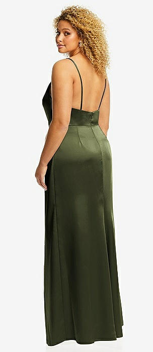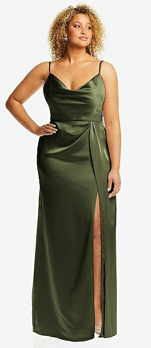 Spaghetti Strap Draped Skirt Gown with Front Slit in olive green