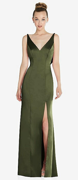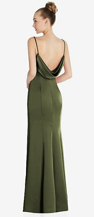 Draped Cowl-Back Princess Line Dress with Front Slit in olive green