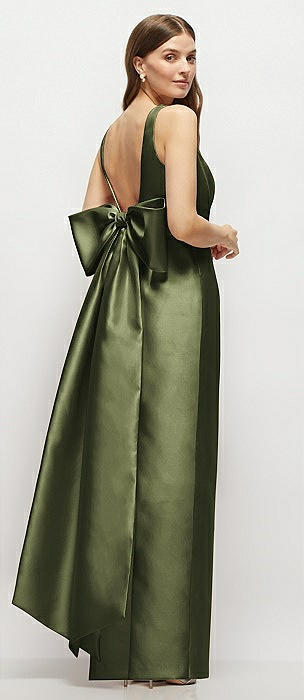 Deep V-back Satin Trumpet Dress with Cascading Bow at One Shoulder in olive green