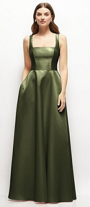 Square-Neck Satin Maxi Dress with Full Skirt in olive green