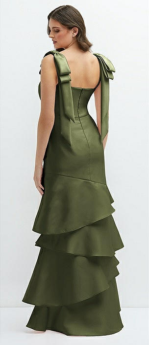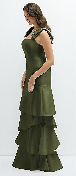 Bow-Shoulder Satin Maxi Dress with Asymmetrical Tiered Skirt in olive green
