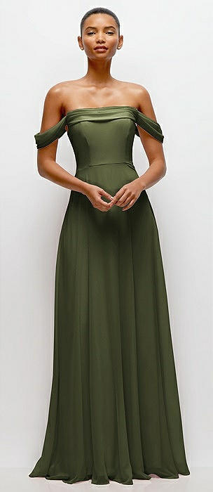 Off-the-Shoulder Draped Neckline Maxi Dress in olive green