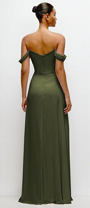 Bow-Shoulder V-Back Chiffon Gown with Front Slit in olive green