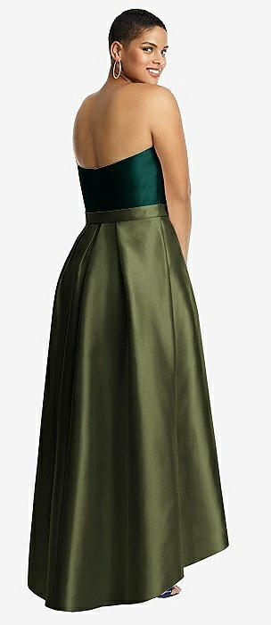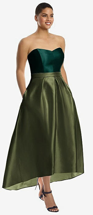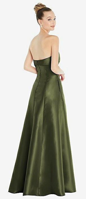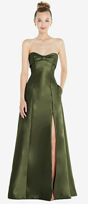 Bow Cuff Strapless Satin Ball Gown with Pockets in olive green