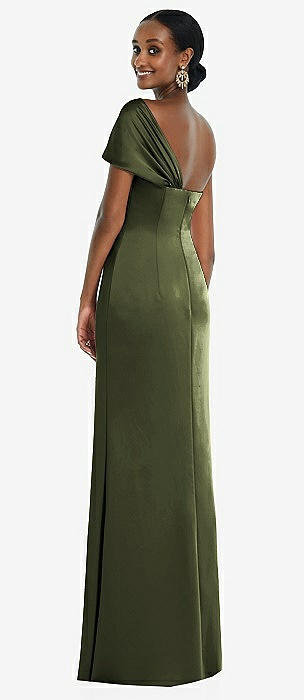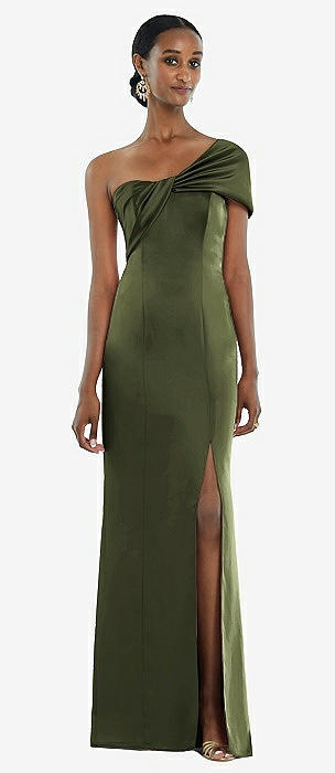 Draped One-Shoulder Satin Trumpet Gown with Front Slit in olive green