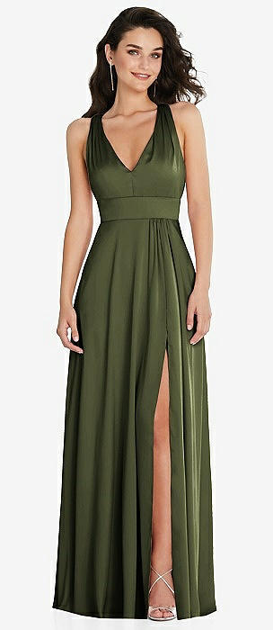 Shirred Shoulder Criss Cross Back Maxi Dress with Front Slit in olive green