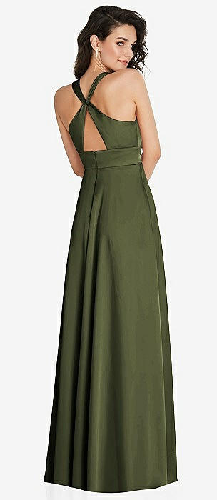 High Neck Backless Maxi Dress with Slim Belt in olive green