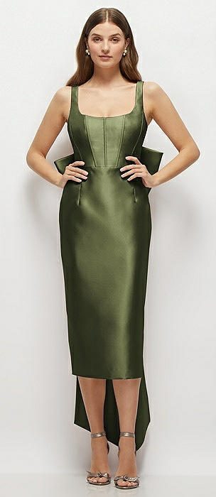 Scoop Neck Corset Satin Midi Dress with Floor-Length Bow Tails in olive green