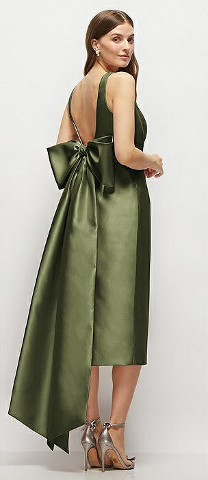 Scoop Neck Satin Column Midi Dress with Bow at Empire Waist in olive green