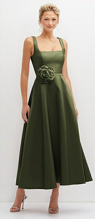 Scoop Neck Corset Satin Midi Dress with Floor-Length Bow Tails in olive green