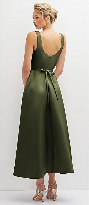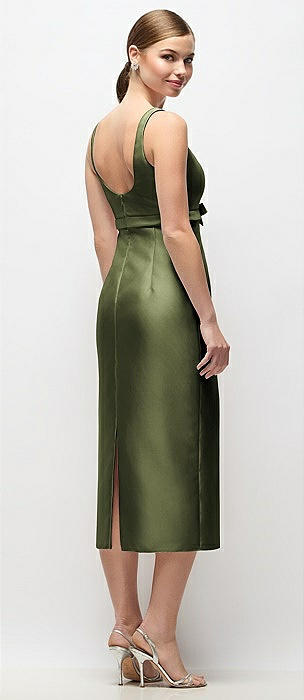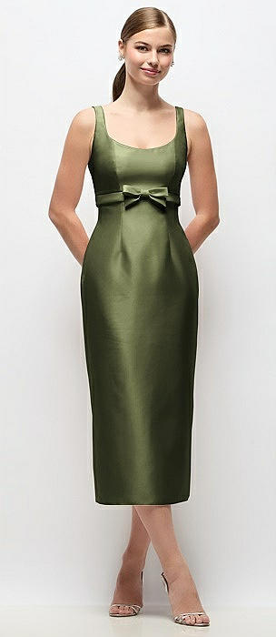 Scoop Neck Satin Column Midi Dress with Bow at Empire Waist in olive green