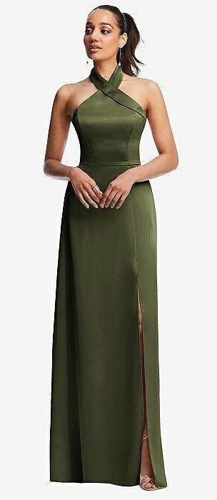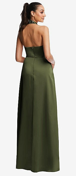 Draped Twist Halter Tie-Back Trumpet Gown in olive green