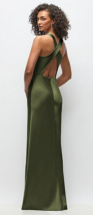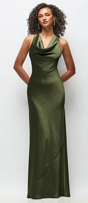 Cowl Neck Criss-Cross Back Satin Maxi Dress in olive green