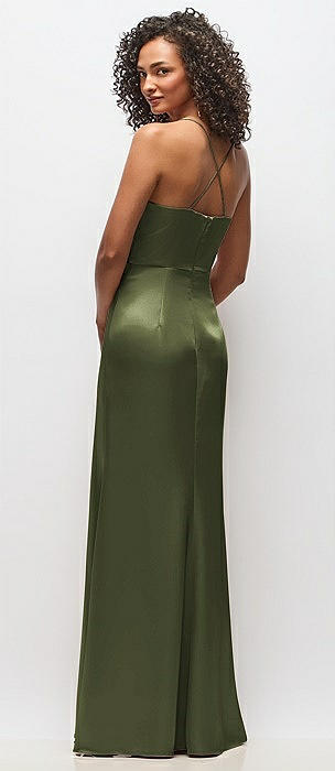 Cuff Neck Satin Bias Maxi Dress with Self-Tie Spaghetti Straps in olive green