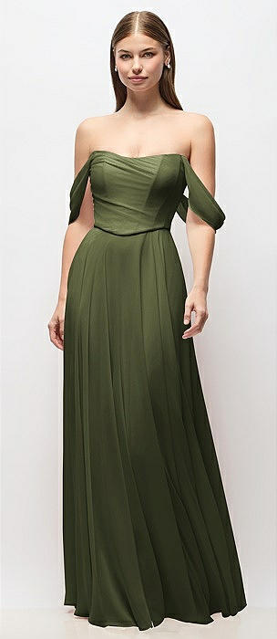 Off-the-Shoulder Basque Corset Chiffon Maxi Dress in olive green