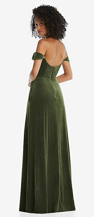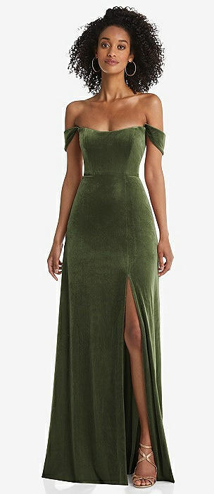 Off-the-Shoulder Flounce Sleeve Velvet Maxi Dress in olive green