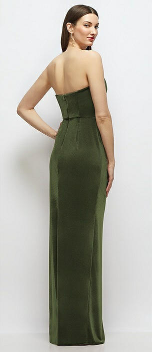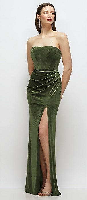 Strapless Corset Bodice Velvet Column Maxi Dress in olive green