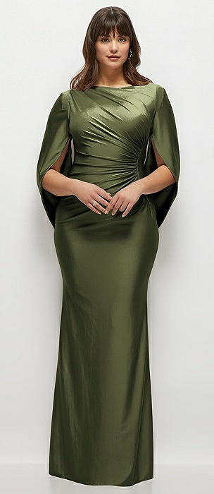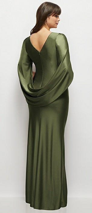 Draped Stretch Satin Maxi Dress with Built-in Capelet in olive green