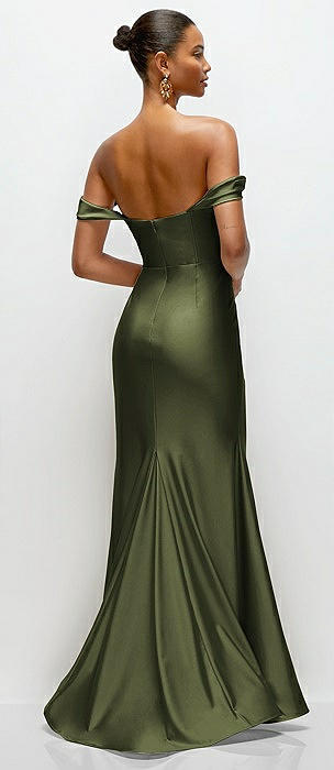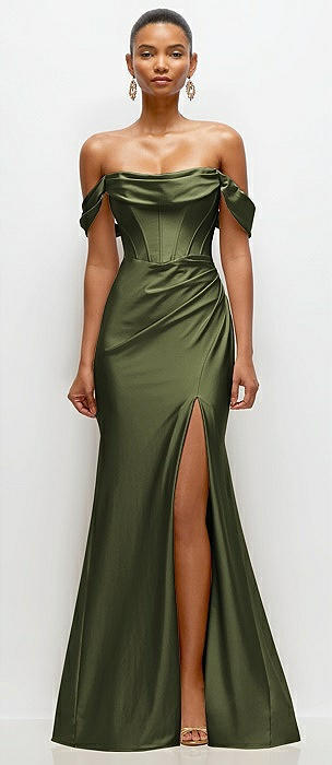 Off-the-Shoulder Corset Stretch Satin Mermaid Dress with Slight Train in olive green