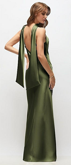V-Neck Halter Satin Trumpet Gown in olive green
