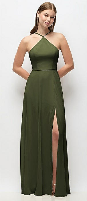 High-Neck Halter Stretch Satin Maxi Dress with Bias A-line Skirt in olive green