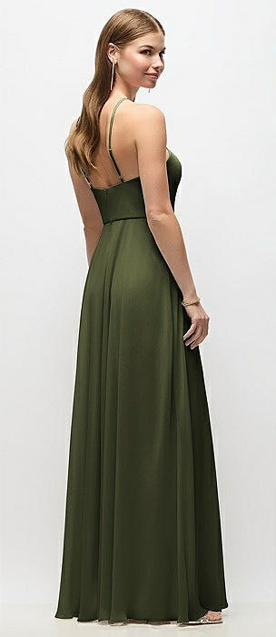 High-Neck Halter Chiffon Maxi Dress with Adjustable Spaghetti Straps in olive green