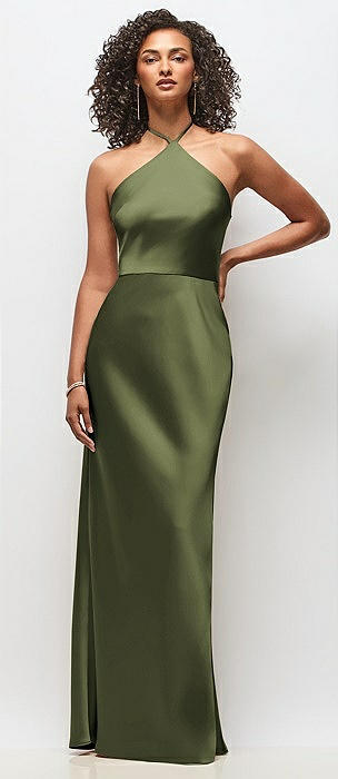 High-Neck Halter Stretch Satin Maxi Dress with Bias A-line Skirt in olive green