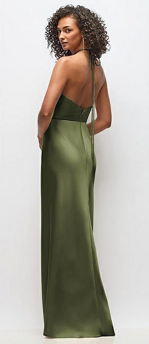High-Neck Halter Open-Back Satin Trumpet Dress in olive green