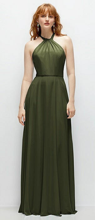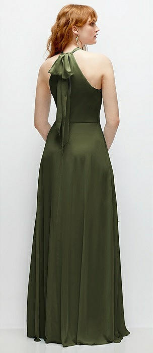 Shirred Halter Chiffon Maxi Dress with Back Sash-Tie Closure in olive green