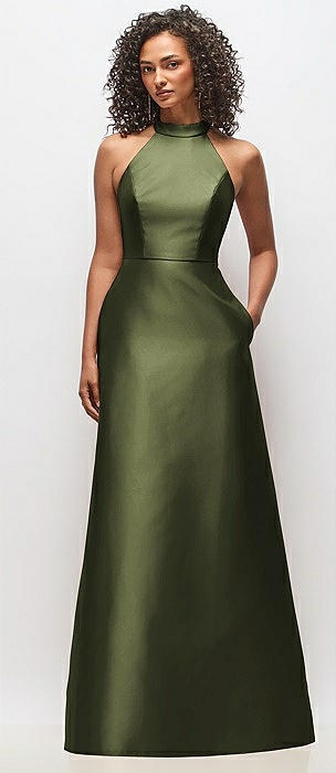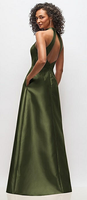 High-Neck Halter Open-Back Satin Trumpet Dress in olive green