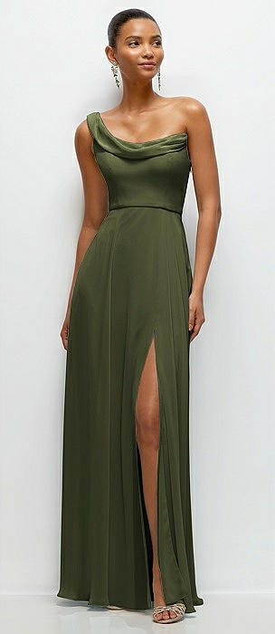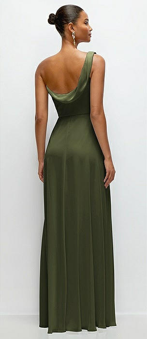 Chiffon One-Shoulder Maxi Dress with Draped Cowl Neckline in olive green