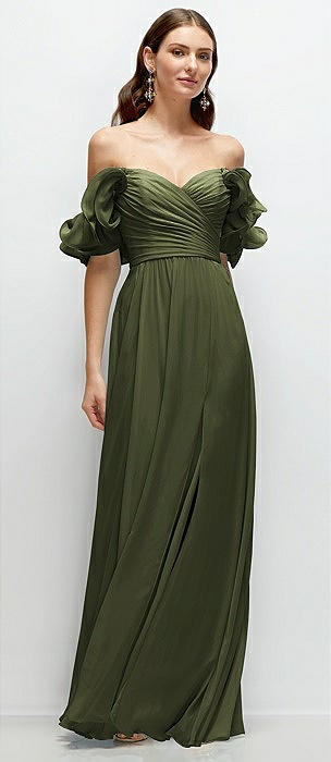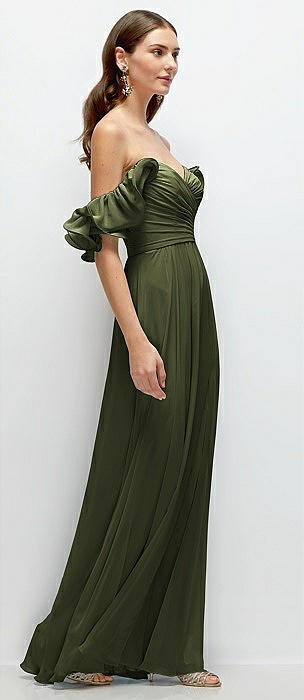 Off-the-Shoulder Draped Chiffon Maxi Dress in olive green