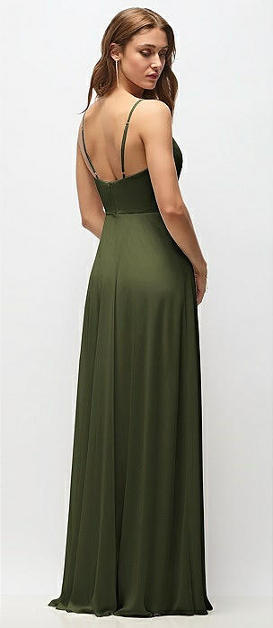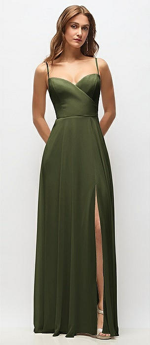 Wrap Bodice Chiffon Maxi Dress with Adjustable Spaghetti Straps in olive green